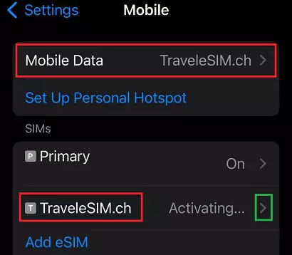 Set Mobile Data to the new TraveleSIM.ch eSIM then Tap on the green arrow to enable Roaming.