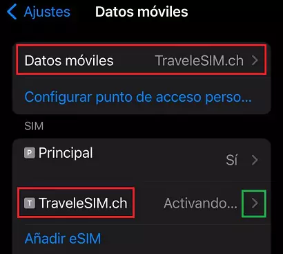 Configura los Datos Móviles en la nueva eSIM de TraveleSIM.ch y luego Pulsa en la flecha verde para activar la Itinerancia.